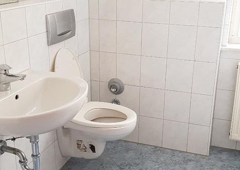 Das Tageslichtbad ist ausgestattet mit Wanne, WC, Waschbecken.