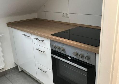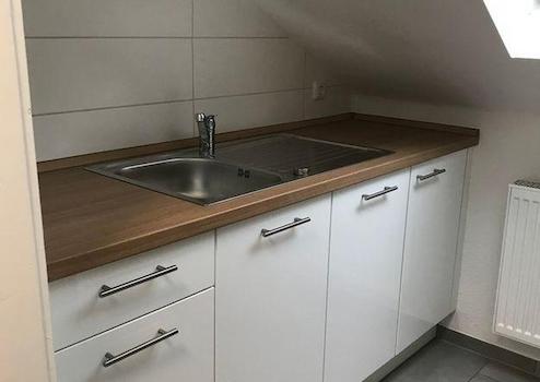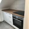 Die Einbauküche ist neu. Allerdings ist die Deckenhöhe aufgrund der Dachschräge in der Küchen-Nische sehr niedrig.