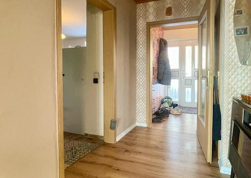 Die Wohnfläche von ca. 100 m² verteilt sich auf Erd- und Obergeschoss mit einer klar strukturierten, funktionalen Raumaufteilung. Im Erdgeschoss bildet das helle Wohnzimmer den Mittelpunkt des Hauses. Von hier aus besteht direkter Zugang zur überdachten Südterrasse, die den Wohnraum sinnvoll erweitert und ganzjährig nutzbar ist. Die Küche bietet ausreichend Arbeitsfläche und Platz für den Alltag. Ergänzt wird das Erdgeschoss durch den Eingangsbereich mit Flur sowie ein separates Gäste-WC.