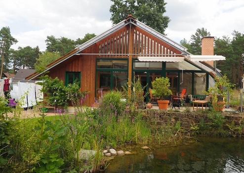 Die Heizung erfolgt über einen wassergeführten Kamin als Zentralheizung mit Holzfeuerung über Pufferspeicher oder wahlweise elektrisch, Holzverbrauch ca. 12 Rm/a., Vorrat für 2 Jahre vorhanden. Das Haus ist barrierefrei mit einem großzügigen Wintergarten, dem eine Terrasse vorgelagert ist mit einem Steg, als Zugang zum Teich. Der Teich hat eine automatische Filteranlage und eine Größe von ca. 95 m² mit Fischbesatz, kann auch als Badeteich genutzt werden. Ein hauseigener Brunnen versorgt den Teich und die Beregnungsanlage.