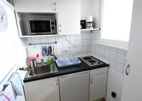 Helles, besonntes Studio mit Balkon für 1 Person mit bequemem Doppelbett (French Size). Umfangreich ausgestattete Einbauküche mit Kühlschrank, Doppelkochfeld und Mikrowelle, Kaffeemaschine, Toaster, Geschirr und Besteck. Bad mit Badewanne, Esstisch und bequemen Fernseh-/Lesesessel. Vorraum mit Kleideraufbewahrung. Klingel mit Türöffner. Sat-TV und Radio. Das Studio befindet sich im 4. OG mit Fahrstuhl.