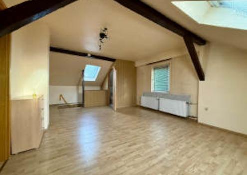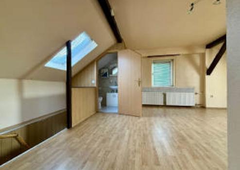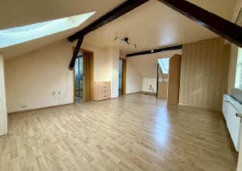 Diese Etage umfasst einen Flur, zwei Zimmer sowie ein Durchgangszimmer (im Grundriss als Diele bezeichnet). Die große, längliche Küche bietet Zugang zu einem überdachten Balkon, der zum Verweilen einlädt, sowie zum Dachboden (reine Nutzfläche). Auf der Etage finden Sie auch ein Tageslichtbad mit Dusche, Waschbecken und WC.