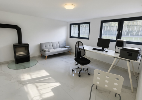 Der integrierte Einliegerbereich ist intern angebunden und eignet sich hervorragend für Gäste, Familie, Homeoffice oder berufliche Nutzungen wie Praxis, Coaching, Beratung oder kreative Tätigkeiten. Große Fensterflächen sorgen für viel Tageslicht.