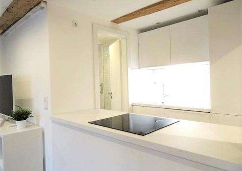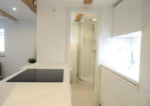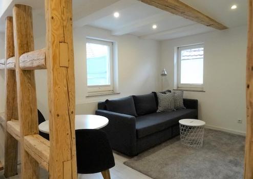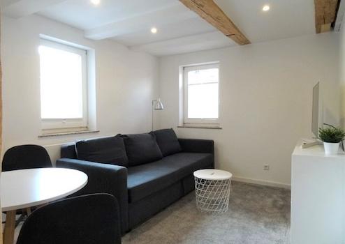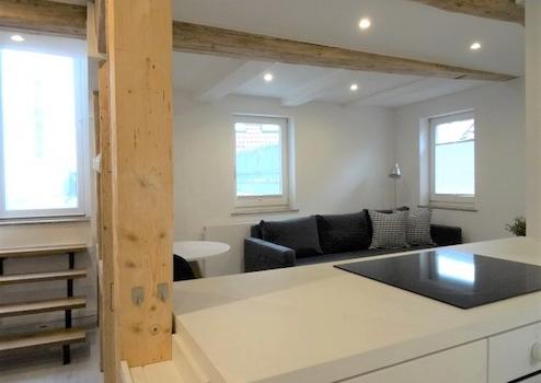 Bei möblierter Vermietung ist im Wohnzimmer die Einrichtung sehr geschmackvoll und bietet ein gemütliches Sofa mit Couchtisch sowie einen Esstisch. Die weiße zum Wohnzimmer offene Inselküche ist mit modernen Möbeln und Geräten ausgestattet.