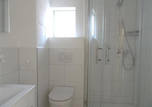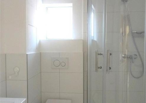 Das Tageslicht Bad mit Dusche hat moderne Armarturen.