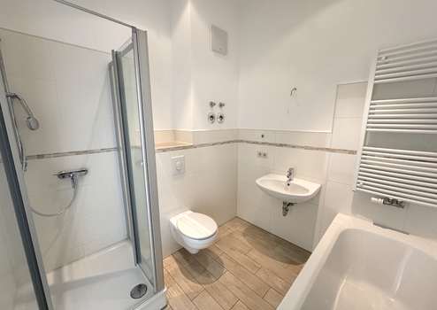 - Badezimmer mit Badewanne, Dusche und Waschmaschinenanschluss