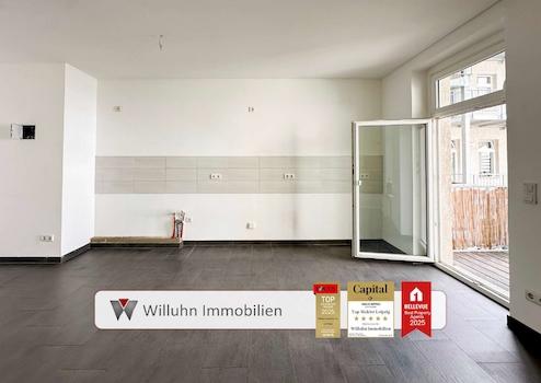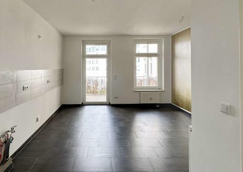 Besonders beeindruckend sind die außergewöhnlich großen Zimmer, die der Wohnung ein offenes, einladendes Flair verleihen. Die gut geschnittene Küche bietet ausreichend Platz für gemeinsame Kochabende mit der ganzen Familie und verfügt über einen direkten Zugang zum Balkon mit Blick auf den MDR-Turm.
