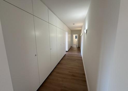 Auch vom daneben liegenden Home-Office aus hat man Zugang zur Terrasse. Am Ende des Ganges liegen das Schlafzimmer und das Bad mit Dusche und Fenster.