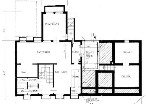 Tanzfläche 18,80 m², Gastraum 36,26 m², Bar 8,14 m², Gastraum mit Abstellraum 24,96 m², WC Damen und Herren 10,73 m², Küche 18,24 m², Keller 15,05 m², Keller 16,34 m², Treppenhaus/Flur 13,00 m².