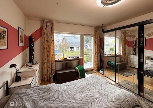 Das Schlafzimmer ist ein ruhiger Rückzugsort mit ausreichend Platz für ein großes Bett und einen Kleiderschrank.