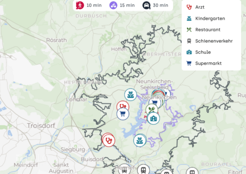 In der unmittelbaren Umgebung finden sich zahlreiche Einrichtungen für den täglichen Bedarf. Ein Lidl-Supermarkt ist in etwa 1,2 Kilometern erreichbar, während weitere Einkaufsmöglichkeiten wie ALDI Süd und Netto Marken-Discount in ca. 2,5 Kilometern Entfernung liegen. Für Familien mit Kindern ist die Nähe zu Bildungseinrichtungen besonders attraktiv. Die Grundschule Wolperath-Schönau ist nur etwa 450 Meter entfernt, und auch weiterführende Schulen wie das Antoniuskolleg und die Gesamtschule Neunkirchen sind in der Nähe.