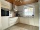 Die Einbauküche wurde im rechten Winkel angelegt und erstreckt sich mit einem Hochschrank und Unterschränken über einen Teil der Westwand und mit Unterschränken unterhalb des Fensters und einem weiteren Hochschrank über die gesamte Nordwand des Raumes.