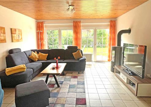 Der Wohnbereich ist absolut hell und freundlich gestaltet und wirkt äußerst geräumig. Er verläuft über die gesamte westliche Hausbreite. Hier schließt sich ein schickes TV Lowboard an der Westwand an.