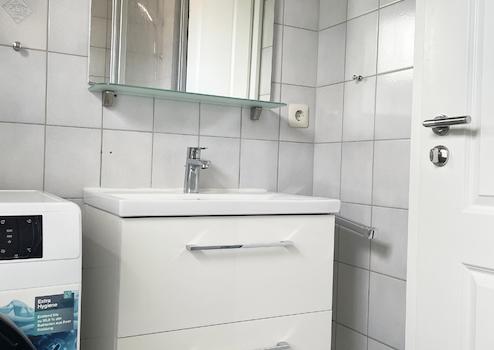 Ein moderner Waschtisch mit zwei Schubladenauszügen und großem, modernem Wandspiegel wurde an der Nordwand, gleich rechts neben der Zimmertür angebracht, so dass links daneben noch eine große Waschmaschine Platz findet. Auf der gegenüberliegenden Seite befinden sich die Dusche in der südöstlichen Ecke und das WC an der Südwand.