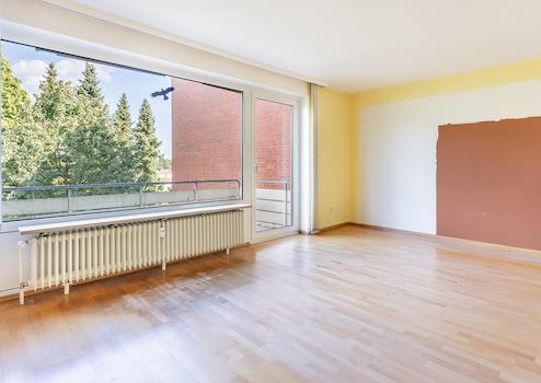 Vom Flurbereich, wo Sie bequem eine kleine Garderobenecke unterbringen können, gelangen Sie in alle Wohnräume. Das großzügig geschnittene Wohnzimmer mit ca. 23 m² und attraktiven Parkettfussboden bietet Ihnen zahlreiche Stellflächen für eine individuelle und gute Möblierung und gewährt den direkten Zugang auf den sonnigen West-Balkon. Hier können Sie erholsame Stunden im Freien und den Ausblick ins Grüne genießen.
