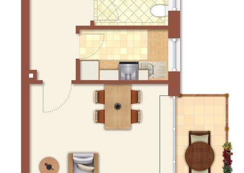 Eine kleine, separate Einbauküche im Holzdekor bietet ausreichend Stauraum in den Ober- und Unterschränken und ist mit den notwendigen Elektrogeräten ausgestattet.