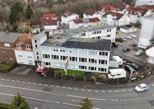 3-geschossiges Gebäude, nicht unterkellert, Flachdach, umgenutzt in Wohnungen (teilweise noch nicht fertiggestellt), Lagerfläche und Doppelgarage: