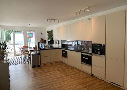 Die hochwertige, sehr gut ausgestattete Küche bildet das Zentrum des Wohnbereichs und geht L-förmig auf einer Seite über in den Sitzbereich und auf der anderen Seite in den Essbereich. An den warmen Tagen erweitert sich der Wohnraum über die bodentiefen Fenstertüren auf den umlaufenden Balkon und lässt den Blick über den attraktiv gestalteten Innenhof schweifen.