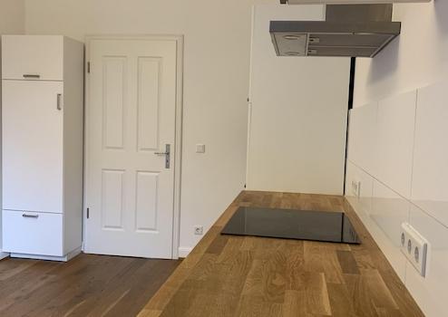 Die Küche verfügt ebenfalls über Stuck und hat ein dreiteiliges großes Fenster mit Stichbogen zum Hof. Daran anschließend der Anbauflur mit Zugang zum Waschmaschinen-/ und Trocknerraum . An diesen Flur angrenzend befinden sich im Anbau die beiden weiteren Zimmer, ebenfalls mit sehr hohen Decken.