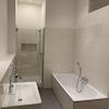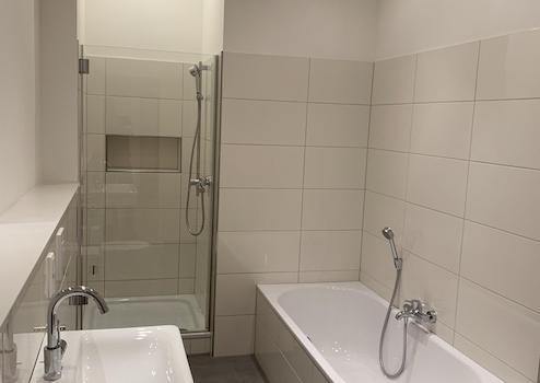 Es wurde ein großflächiger Spiegel im Bad, sowie eine Ganzglas-Duschtür eingebaut. Das Bad verfügt über Dusche und Badewanne.