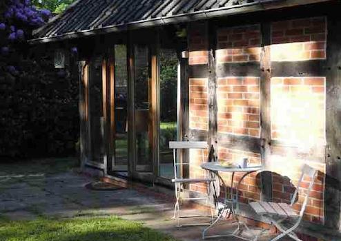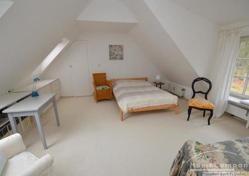 Diese wunderbare 3-Zi. Wohnung liegt sehr idyllisch in einem Naturschutzgebiet im Grünen. Man betritt das Fachwerkhaus über einen kleinen Flur, von dem ein Gäste-WC abgeht und gelangt in das sehr geschmackvoll eingerichtete Wohnzimmer mit einer offenen Balkenlage. Durch die große Fensterfront gelangt viel Licht in den Raum. Von hieraus gelangt man direkt auf die vorgelagerte Terrasse mit einem weitläufigen Blick auf das Grundstück. Über eine Treppe gelangt man in die obere Etage. Hier befinden sich 2 Schlafzimmer. In einem, der beiden Räume befindet sich eine offene Waschmöglichkeit. Die abgeschlossene Dusche mit WC befindet sich direkt daneben. Bei einer Anmietung von 2 Personen erhöht sich die Miete um 150,00€.