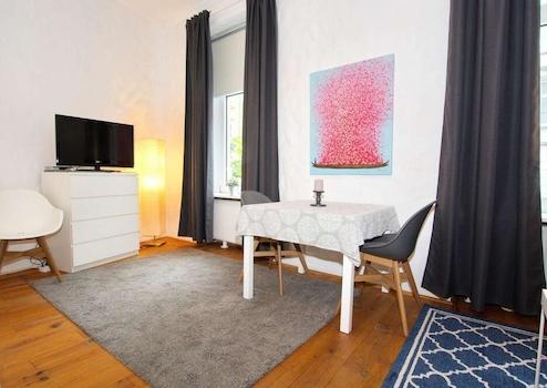 Charme & Flair! Das mit Echtholzboden ausgelegte Apartment bietet einen großen Wohn- und Schlafraum, der durch seine Deckenhöhe und die verputzten Wände eine angenehme Atmosphäre ausstrahlt. Im Schlafbereich steht ein modernes, weißes Bett in der Komfortgröße 140,00 x 2,00m mit einem Nachttisch. Den Wohnbereich bildet ein graues Schlafsofa im schwedischen Stil zusammen mit 3 Beistelltischen und einem TV-Gerät auf einer Kommode. Ein ausziehbarer Esstisch für bis zu 4 Personen rundet diesen Raum ab. Die separate Küche bietet einen Backofen mit Ceranfeld, einen Kühlschrank mit Gefrierfach und sämtliche Kochutensilien mit Geschirr, hier gibt es außerdem einen Frühstücksplatz für 2 Personen. In der Diele befindet sich ein großer Einbauschrank mit viel Stauraum für Kleidung. Das moderne Tageslichtbad bietet eine bodentiefe Dusche mit einer gläsernen Abtrennung, ein Hänge-WC und einen eleganten Waschtisch mit Spiegelschrank. Bettwäsche und Handtücher werden gestellt, in einem eigenen Waschkeller steht eine Waschmaschine zur alleinigen Nutzung. Der Gemeinschaftsgarten mit einer Terrasse darf vom Mieter mitgenutzt werden. Der Mietpreis beträgt € 760,00 für eine Person inklusive aller Energie- und Nebenkosten und der Nutzung des Internet - Zugangs. Der Mietpreis für 2 Personen liegt bei € 885,00. Die Endreinigung obliegt dem Vermieter, erfolgt nach Aufwand und wird mit € 35,00 pro Stunde abgerechnet.