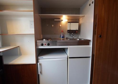 Die Pantry-Küche kann mit einer Schiebetüre zugemacht werden.
