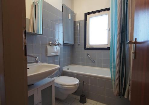 Das Bad ist ausgestattet mit einem Spiegelschrank, Waschtisch, Toilette und Badewanne.