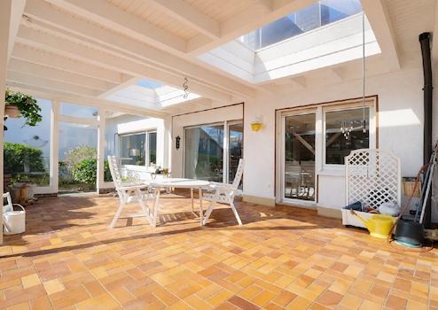 Terrasse/Balkon: Sehr großzügige und überdachte Terrasse im Fachwerkstil mit Glaseinsätzen. Die eingebauten Lichtkuppeln können geöffnet werden.