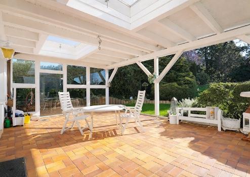 Terrasse/Balkon: Sehr großzügige und überdachte Terrasse im Fachwerkstil mit Glaseinsätzen. Die eingebauten Lichtkuppeln können geöffnet werden.