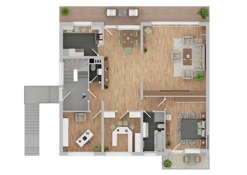 Vom Hausflur aus liegt rechts das Büro/Arbeitszimmer, links das Gäste-WC. Weiter geradeaus befindet sich auf der rechten Seite die gemütliche Bar, dann das Tageslichtbad mit Wanne und Glasdusche sowie ein Zimmer, nutzbar als Schlafzimmer oder Esszimmer. Der sehr üppige Wohn- und Essbereich, links gelegen, mit der angrenzenden Küche gewinnt noch zusätzlich mit dem traumhaften Blick in den wunderschön angelegten Garten.
