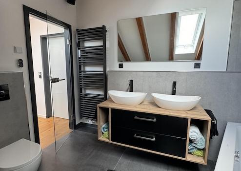 Ein stilvolles Tageslichtbad mit Eckbadewanne, Doppelwaschtisch, WC, praktischem Einbauschrank, moderner elektrischer Fußbodenheizung, LED-Beleuchtung mit Farbwechsel und einem virtuellen Fenster für entspannte Badmomente