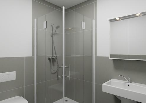 - Kleineres Badezimmer mit Dusche, Waschbecken und WC