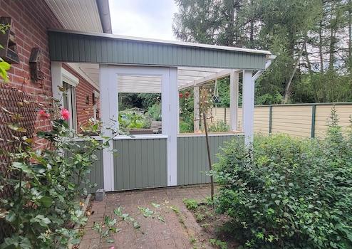 Ein großes freistehendes Nebengebäude wird derzeit als Hobbywerkstatt genutzt. Dort befindet sich auch das Hauswasserwerk, das unabhängig vom Hauswasseranschluss zur Bewässerung des Gartens dient. Hinter dem Nebengebäude haben wir eine Sauna mit Bio-Ofen eingebaut. Damit ist auch Dampf-Sauna möglich. Weitere Unterstellmöglichkeiten für Feuerholz o.ä. schließen sich an.