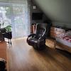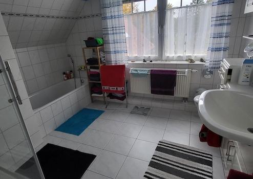 Über die mit Parkett belegte Treppe gelangt man ins Obergeschoss. Hier sind 3 Räume (Schlaf- und Kinderzimmer, zwei davon mit Parkettboden) und das geräumige, geflieste Bad mit Dusche und Badewanne. Auf der Empore ist unter dem Velux-Fenster ein Arbeitsplatz fest installiert. Ein Glasfaseranschluss ist vorhanden (derzeitiger Vertrag: Quix Fiber 50.000/upgrade möglich).