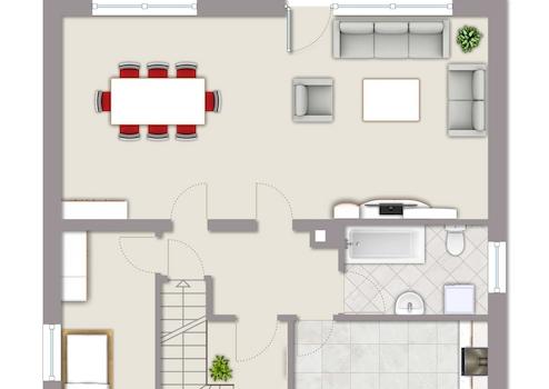 Erdgeschoss: Windfang mit Treppenaufgang ins Dachgeschoss, Flur, kombiniertes Wohn- und Esszimmer mit Terrassenzugang, Gästezimmer, Küche mit Einbauküche, Tageslichtbad mit Badewanne;