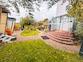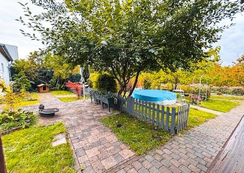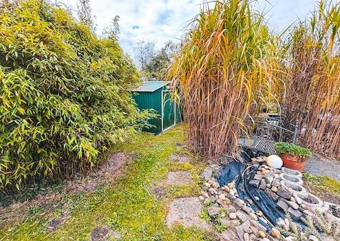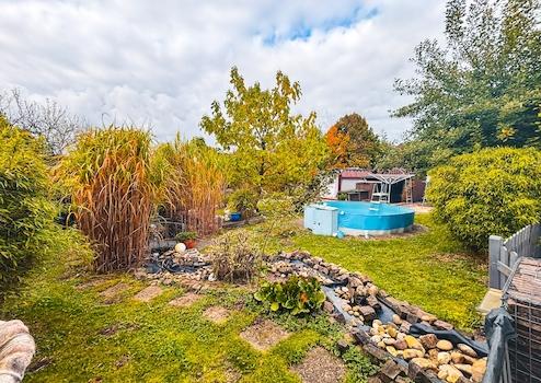 Ein Swimmingpool sorgt an warmen Tagen für Abkühlung und Spaß, während ein praktischer Schuppen ausreichend Stauraum für Gartengeräte, Fahrräder oder Spielzeug bietet.
