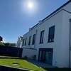 Im Obergeschoss befinden sich zwei helle Kinderzimmer sowie ein großzügiges Schlafzimmer. Bodentiefe Fenster mit Stulp und schwarze, matte Sicherheitsgeländer verleihen dem Haus ein modernes, elegantes Erscheinungsbild. Das Familienbad ist hochwertig ausgestattet mit begehbarer Dusche, Badewanne, WC von Villeroy & Boch sowie 120 × 120 cm Feinsteinzeug in Beige.
