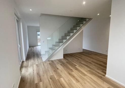 Der helle Eingangsbereich empfängt mit einem großzügigen Flur und einem großformatigen Panoramafenster. Im Erdgeschoss verbindet der offene Grundriss Küche, Wohn- und Essbereich sowie die Terrasse zu einem harmonischen Wohnkonzept. Das offen gestaltete Treppenhaus mit Glasgeländer unterstreicht die moderne Architektur. Ein hochwertiges Gäste-WC mit großformatigen 100 × 100 cm Fliesen ergänzt diese Ebene.