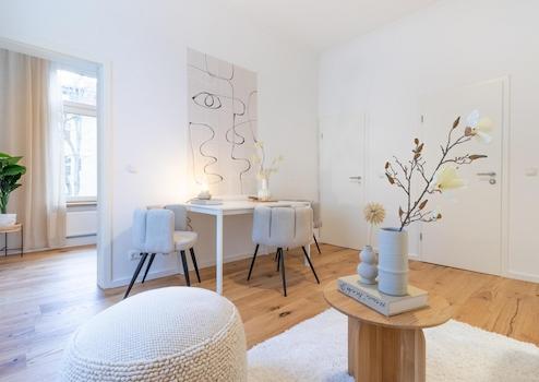 Besonders hervorzuheben sind die hellen, großzügigen Räume mit einer Deckenhöhe von über drei Metern, die ein außergewöhnliches Wohngefühl schaffen und den repräsentativen Charakter des Altbaus eindrucksvoll unterstreichen. Das neu verlegte, hochwertige Echtholz-Eichenparkett verleiht der Wohnung eine warme, elegante Atmosphäre und fügt sich harmonisch in das stilvolle Gesamtbild ein.