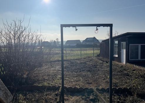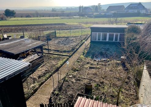 Im hinteren Teil des ca. 560 qm großen Grundstücks befindet sich der Garten, von dem aus man einen schönen Blick in die umgebende Landschaft hat. Ein praktisches und gemütliches Gartenhäuschen mit Stromanschluss, als Unterstell- und/oder Partyraum befindet sich hier zusätzlich.