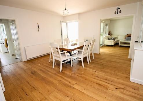Beim Betreten des Hauses gelangen Sie direkt in das zentral gelegene Esszimmer, das als offener Treffpunkt den Mittelpunkt des Hauses bildet. Von hier aus erschließen sich alle weiteren Räume und schaffen ein durchdachtes Wohnkonzept mit kurzen Wegen und einem angenehmen Raumfluss.