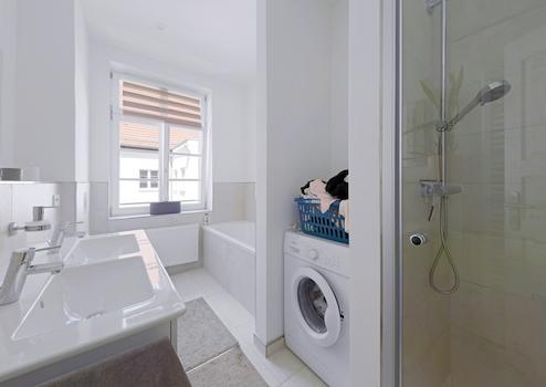 Das Tageslichtbad ist mit einer Badewanne sowie einer separaten Dusche ausgestattet und überzeugt durch moderne, geschmackvolle Materialien. Ein zusätzliches Gäste-WC sorgt für Komfort im Alltag.