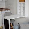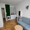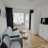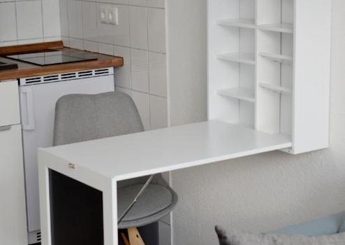 Dieses Apartment ist ein kleines Raumwunder. So gibt es eine hochwertige Schlafcouch für 2 Personen. Einen kleinen Schreibtisch, der bei Nichtnutzung eingeklappt an der Wand befestigt ist. Der Südbalkon hat eine Abstellmöglichkeit und Platz für einen Stuhl.