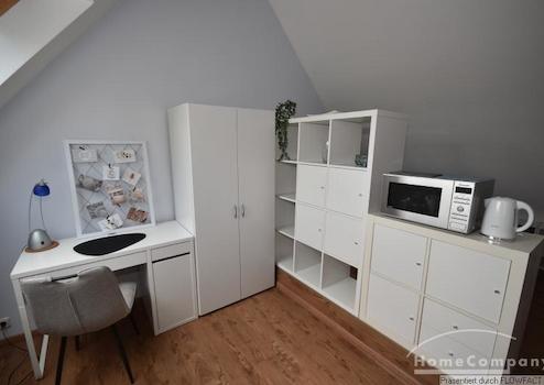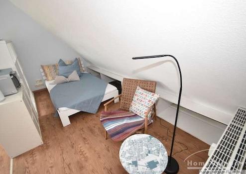 Dieses moderne Apartment befindet sich im Dachgeschoß eines Hauses im historischen Schnoorviertel. Eine geschickte Raumgestaltung, trennt den Raum in einen offenen Wohnbereich mit Singleküche und einen Schlafbereich mit Einzelbett. Ein kleiner Arbeitsplatz unter dem Fenster ergänzt den Wohnbereich. Flache Kommoden sorgen für eine effiziente Nutzung des vorhandenen Platzes. Das helle Tageslichtbad mit Dusche vervollständigt das Angebot.