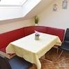Voll ausgestattete Küchenzeile mit Herd, Mikrowelle, Kühlschrank, kompletter Geschirrausstattung und einem Essplatz (Tisch mit 2 Stühlen und Eckbank).