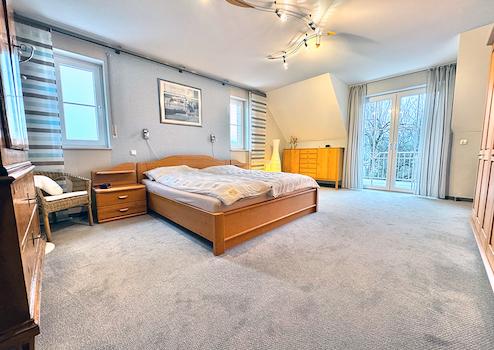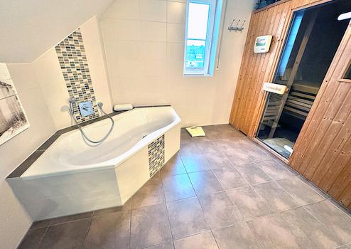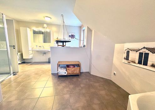 Obergeschoss: Elternschlafzimmer mit Balkonzugang und Bad "en Suite" (mit Sauna, ebenerdiger Dusche, WC, Bidet, Waschtisch und Wanne), Kinderzimmer I, Diele, Kinderbad (mit WC, Dusche und Waschtisch), Hauswirtschaftsraum