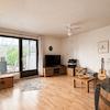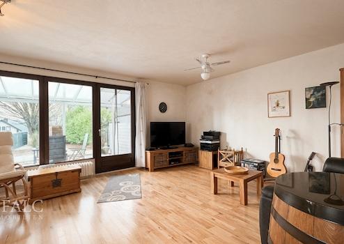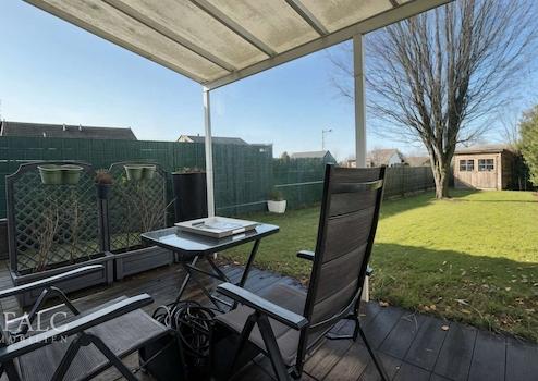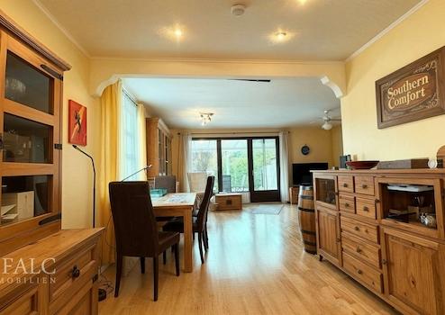 Der Wohnbereich bildet das Herzstück des Hauses. Großzügige, bodentiefe Fensterflächen sorgen für eine hervorragende Belichtung und schaffen eine helle, freundliche Wohnatmosphäre. Der Raum bietet genügend Fläche für eine komfortable Sofalandschaft sowie einen separaten Essbereich und lässt sich flexibel möblieren. Der direkte Zugang zur überdachten Terrasse erweitert den Wohnraum in den Sommermonaten nach außen und ermöglicht einen fließenden Übergang in den Garten. Die Terrasse bietet Platz für eine Sitzgruppe und lädt zu gemütlichen Mahlzeiten im Freien ein. Der angrenzende Garten ist übersichtlich und pflegeleicht angelegt und bietet zugleich Raum für spielende Kinder, gärtnerische Gestaltung oder entspannte Stunden in ruhiger Umgebung. Zusätzlich ist der Garten über den Keller, über einen seitlichen abschließbaren Zugang und über ein Gartentor am Ende des Gartens bequem erreichbar.