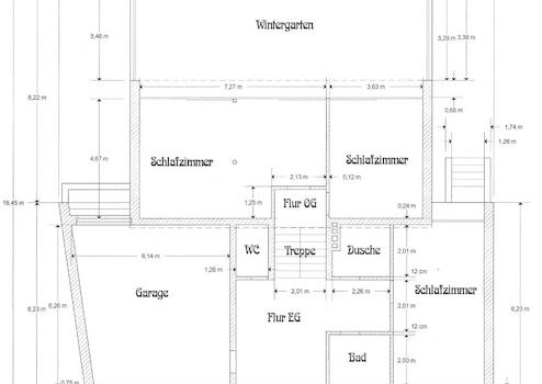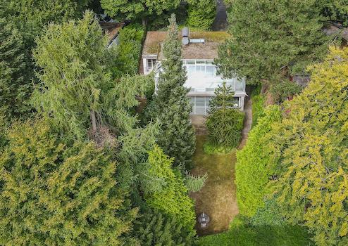 Das massive Wohnhaus wurde Anfang der siebziger Jahre in Split-Level-Bauweise errichtet. Der Grundriss gestaltet sich mit großzügigen Räumen auf vier versetzten Ebenen. Raumbreite Fensterfronten öffnen sich zum Garten und der Wintergarten im Obergeschoss ermöglicht einen Rundblick über das idyllische Grundstück.