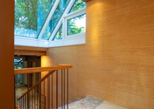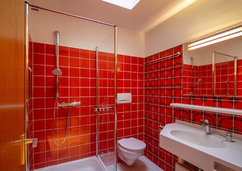 Auf der Ebene des Gartengeschosses befindet sich das geräumige Wohnzimmer, an welches sich die offene Küche anschließt. Vier weitere Zimmer verteilen sich auf drei Ebenen und können bei Bedarf wieder in sechs Zimmer unterteilt werden, wie es der ursprüngliche Grundriss vorsah. Es gibt zwei Bäder, sowohl mit Dusche als auch mit Badewanne und eine Gästetoilette. Die knalligen Farben der Fliesen spiegeln den Zeitgeist wider.
